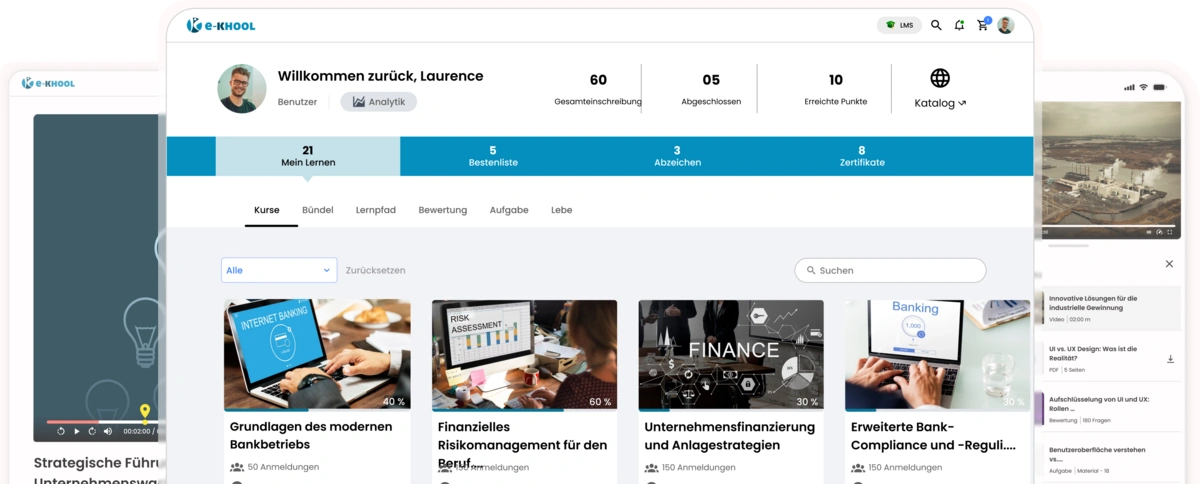 Das e-KHOOL LMS-System ermöglicht die nahtlose Verknüpfung von Lernbedürfnissen im Unternehmens- und Bildungssektor, um Onboarding, Kompetenzentwicklung, Compliance-Lernen, gemischte Klassenzimmer und virtuelle Programme zu unterstützen.