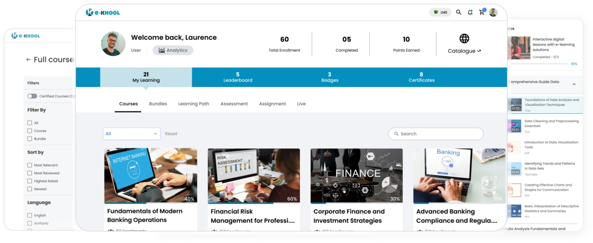 Develop and organize learning materials using simple editors for lessons, quizzes, videos, and downloadable resources using e-KHOOL LMS.