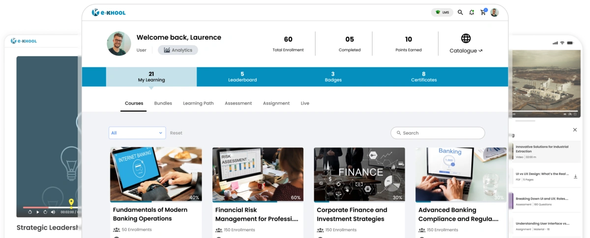 A complete e-KHOOL LMS for Newzie institutions and companies with 100+ tools for online learning content, learner engagement, analytics, and compliance training programs.